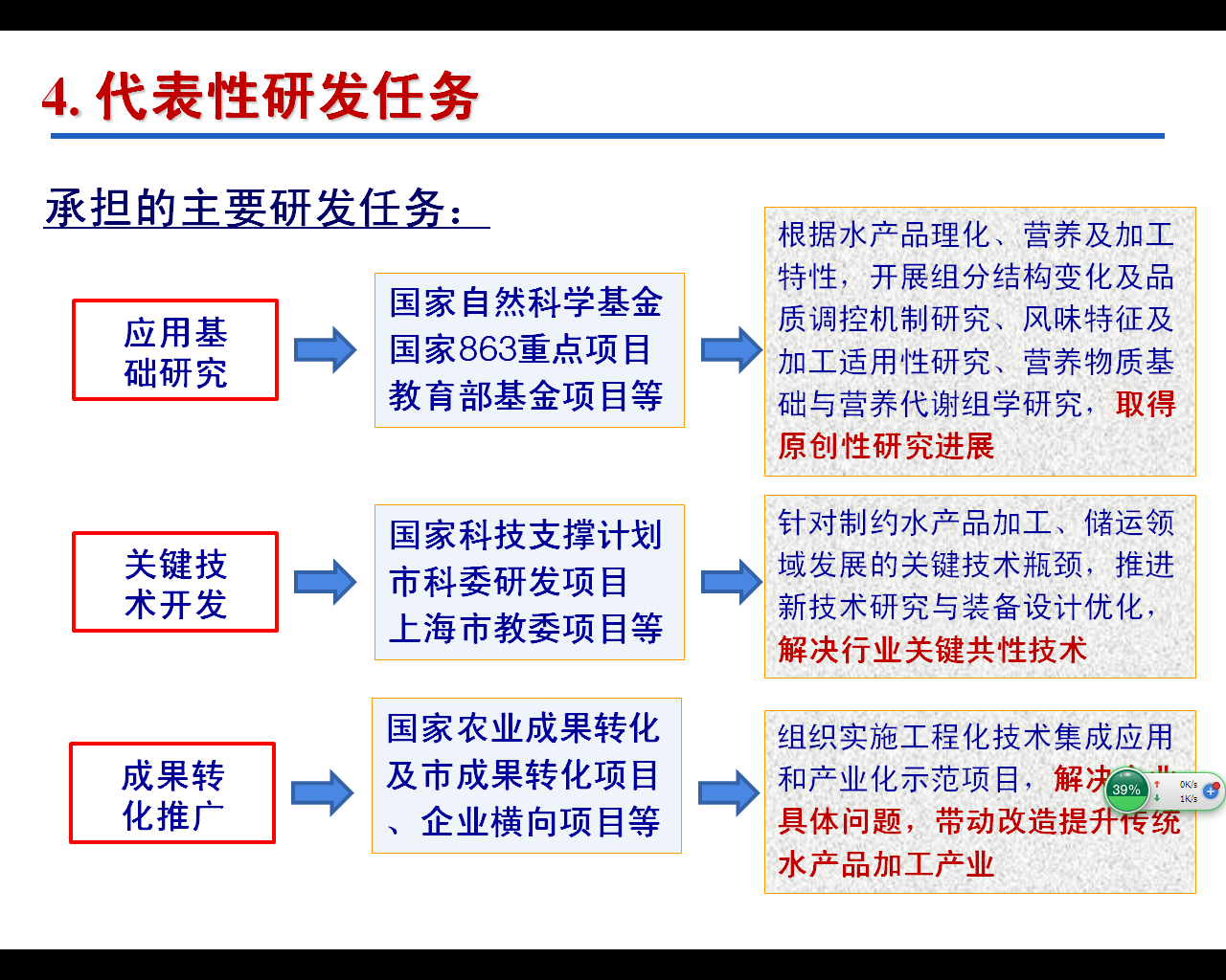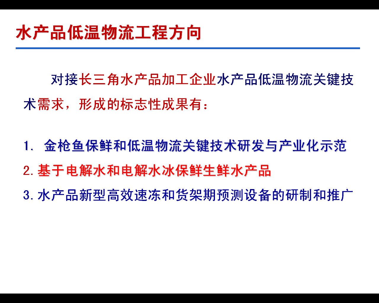 主要研究水产品低温贮藏和流通过程中质量多因子协同控制技术,使水产品货架期得到有效延长,提升其品质和贮藏稳定性;不同水产品低温流通工艺和冷藏链技术集成与冷藏链相关设备优化设计,以及水产品生产、贮藏和食品冷藏链流通过程中的质量控制技术和HACCP控制体系的构建;水产品在低温物流中的标准、操作规程等研究,以利用冷藏链技术来保证水产品安全、高品质、低损耗地流通。