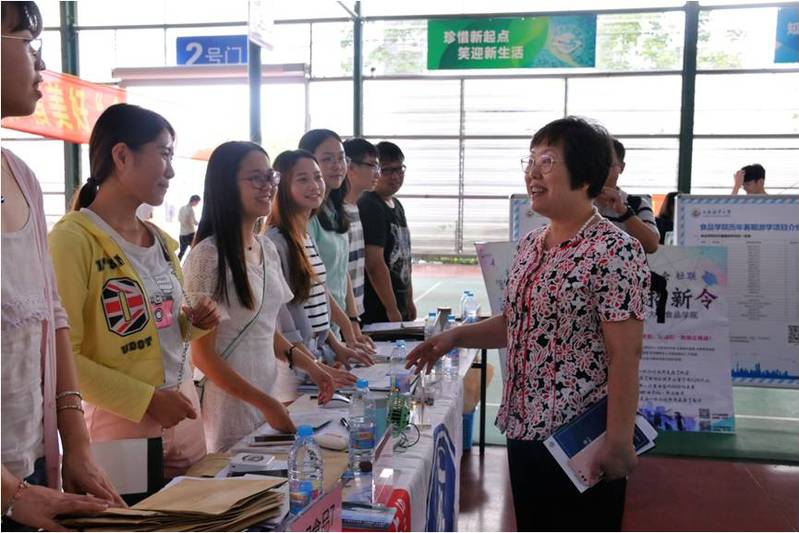 9日报到当天,学院为学生提供“一站式”服务,学生在高年级学长引导下即可自行完成报到和注册,家长们则在休息区休息,让学生真正独立自主完成大学教育第一课。在朋辈教育概念指引下,食品学院还设立了新生辅导员班级助理,每个新生班级配备1-2名优秀的学长协助辅导员做好迎新阶段的教育和服务工作,取得初期效果。