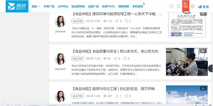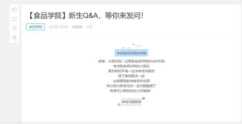 此外,为使新生更好地融入大学生活,食品学院借助易班新媒体也相继推出了“新生攻略”系列推送、“食品学院团委帮你答疑——红旗流动站”等活动。这让新生们在一定程度上了解了入学流程和大学的校园生活以及学习。应届各位新生的是崭新的环境、多彩的生活、丰富的活动、知识的盛宴。