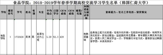 根据教务处文件《关于选派2018-2019学年春季学期赴韩国仁荷大学交流学生工作的通知》和《Kaiyun官方网站登录入口学生出国(境)交流学习工作实施办法(试行)》的要求,经个人申请,食品学院审议,现将食品学院2018-2019学年春季学期赴韩国仁荷大学交流学习候选人进行排序后上报教务处,特此公示。公示时间2018年9月25日—2018年9月28日。