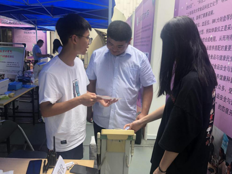 上海海洋大学的志愿服务站点一经布置,社区群众就纷纷前来,体脂仪、血压仪等仪器前人头攒动,志愿者们根据相关仪器测量的数据为社区居民提供关于食品营养搭配的建议,现场群众们纷纷点头称赞。同时志愿者们也热情地为社区居民科普了许多食品安全相关知识,依据膳食宝塔等相关数据讲述人体一天对各类食物的摄入量以及日常食品安全小常识等等。