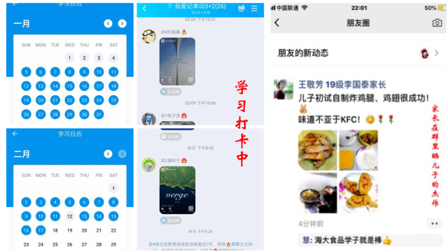 19级辅导员郝洁以身作则,发挥榜样示范作用,带动学生进行单词、读书学习,打造线上学习大联盟,同时通过头脑风暴,根据同学们的建议拟定了群内健身打卡、TIMING自习室、书香满屋、技能修炼场、鼠目“春”光、疫情防控专项学习以及特别暖心活动“今天我主厨”等六项计划,鼓励同学们居家莫等闲,合理安排时间,抓住每一个机会提升自己。