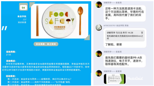 院团委书记刘源在做好专职辅导员日常工作的同时,发挥专业特长,带领团学骨干组建线上学习活动小组,成员近200人成员,通过创新活动形式,举办线上美食大赏等,鼓励同学们将食品专业知识与家务劳动结合,为滞留在家的同学们营造“停课不停学”的积极氛围,度过多彩的防疫生活。