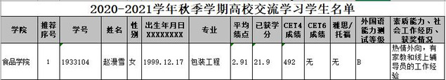 根据教务处文件《关于选派2020-2021学年秋季学期赴台湾海洋大学交流学习的通知》,经个人申请,学院审议,共1位同学申请且符合各项指标,特此公示。公示时间2020年4月24日-2020年4月27日。