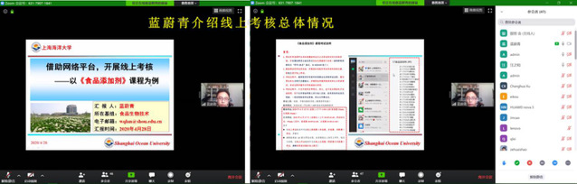在交流发言阶段,卢瑛老师结合泛雅平台考试模块使用情况,从考前准备、考务工作、在线考试注意事项三部分介绍了在线考试的组织工作。她指出考前准备环节非常重要,需要提前告知学生学校的要求、在线考试注意事项(包括考试平台、考试方式、考试工具、考试签到方法、提交方式、全程视频录制等),组织考试模拟、模拟签到视频等,监考老师要熟悉考试平台的各种防作弊功能。同时,她指出关键还是要做好试卷命题工作,根据课程特点合理选择题型、掌握好难易程度,并展示了考试成绩分析和考场监控视频资料。蓝蔚青老师则以《食品添加剂》课程为例,介绍了利用钉钉视频会议、智慧树平台考核辅之、以微信群通知的组织完成的课程考核情况,以课程考试说明的方式呈现了考试组织工作的各个环节,展示了考试时的宣读考纪、证件检查等细节;余克志老师重点就在线考试过程中学生端出现的问题,与泛雅平台及学院老师进行了交流。