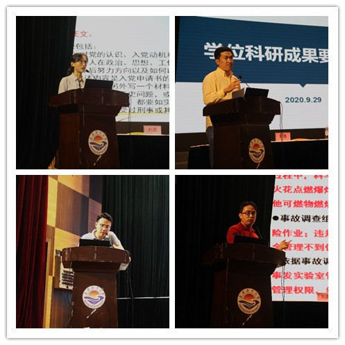 在接下来的专题报告会阶段,宋益善副院长、蓝蔚青老师、杨晗老师、阎俊老师分别就相关专题为新生做了详细介绍。首先,杨晗老师为新生进行入党启蒙教育,讲解入党的基本流程。宋益善副院长就食品学院的研究生学位管理及相关制度作了介绍,并对学位认定的科研成果要求、学院奖学金评定事宜作了说明,勉励新生要踏实研究,学有所成。研究生秘书阎俊老师对新生的选课情况进行了介绍和答疑。最后,食品学院实验室管理中心副主任蓝蔚青老师向全体新生介绍了学院的大型仪器,解析了实验室安全管理。蓝老师以其丰富的理论和实践安全知识为同学们丰富了实验室安全知识,并提醒全体新生要提高实验安全意识,遵守学院实验管理规则。