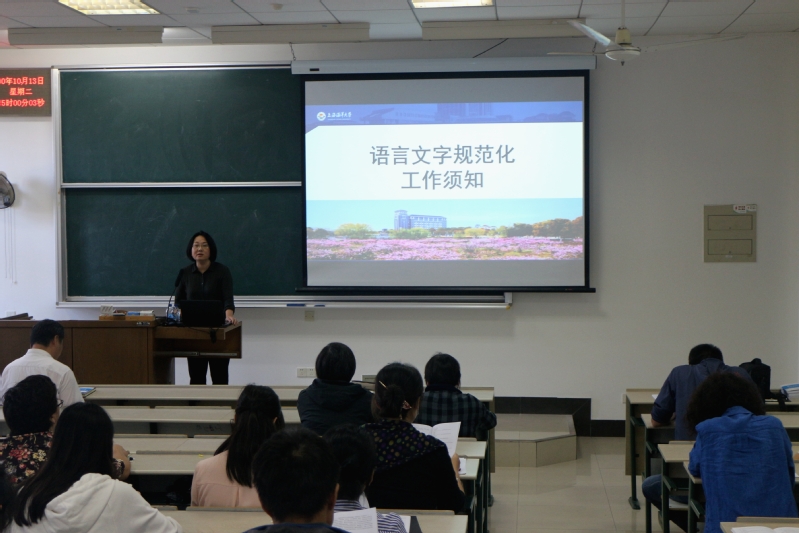 根据校语委会的工作部署,食品学院于10月13日下午组织召开全体教职工大会,学习语言文字法律法规、组织开展自查自纠工作,以更好地迎接语言文字规范化达标建设抽查工作。会议由院党委书记陈慧做动员部署,近百名教职工参加了学习培训。