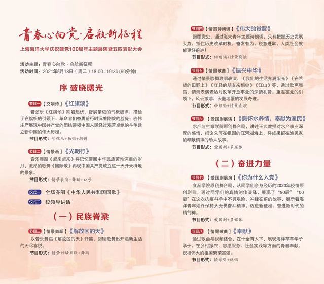 恰逢建党100周年,海大青年紧跟时代潮流,在党的领导下秉持校训精神。为纪念100年这一特殊节点,上海海洋大学决定于5月18日(周二)晚18:00举办庆祝建党100 周年主题展演暨五四表彰大会。请各基层团支部组织团员青年在线观看直播。