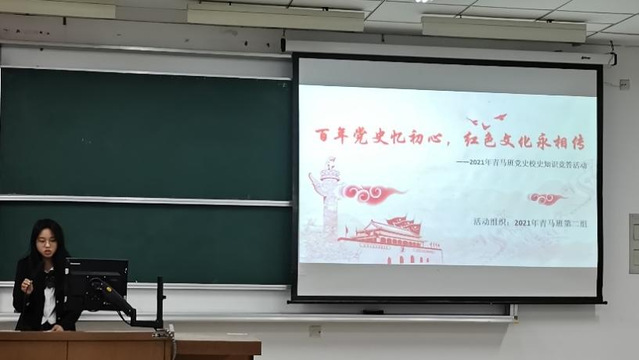 建党百年之际,为了普及党史知识,同时让同学们更好地理解海大“勤朴忠实”校训深刻内涵,传承海大精神,成为一名优秀的海大人,2021届食品学院青马班于5月18日晚上20:00在1105教室开展了“百年党史忆初心,红色文化永相传”党史校史知识竞答活动。在主持人阮怡婷的视频引入介绍党史校史后,知识竞答正式开始。