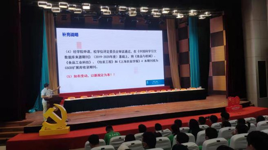 会议第二阶段专题报告会分别为入党启蒙教育、规则意识教育、研究生学位管理制度介绍和实验室安全专题报告。首先,由食品学院专职组织员杨晗为新生们开展入党启蒙教育,杨老师从“党章”、“党史”、及“如何树立正确的入党心理动机”等方面入手,叮嘱同学们要倍加珍惜中国共产党多年艰苦奋斗打下的良好基础,主动学习党的理论知识,提高自身思想觉悟,努力发展成为一名合格的中共党员。紧接着,由院党委副书记孙红刚开展规则意识教育,告诫同学们在疫情防控期间严格遵守疫情防控相关规定,做好自我防护措施,为自己及他人的健康安全着想。副院长宋益善和研究生秘书阎俊对研究生的培养情况进行了介绍和答疑。最后,学院实验中心主任蓝蔚青以其丰富的理论和实践安全知识为同学们讲解了实验室安全知识,并提醒全体新生要提高实验安全意识,遵守学院实验管理规则。