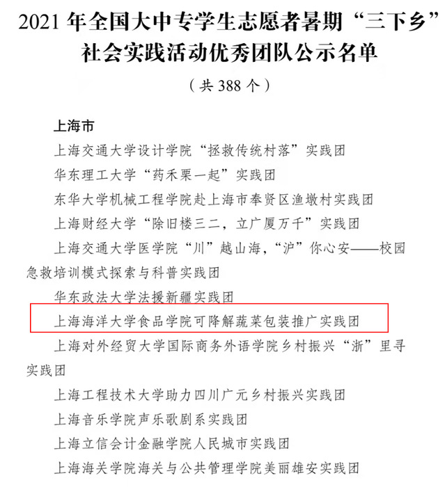 整个项目最大亮点就是所提供的新型蔬菜包装材料实现了生物可降解性和食品安全性的有机结合。截止目前,团队完成支撑论文3篇、获得实用新型专利1项、撰写40000字的总结材料,拍摄约600张实验照片,并在院、校、区级等相关新媒体平台进行报道,影响覆盖面广。实践表明,该包装材料降低了蔬菜储运过程中的损耗,同时积极响应“限塑令”的政策要求,促进了垃圾分类治理的问题,减少不必要的碳排放。该项目荣获2021年上海市“知行杯”大学生社会实践大赛三等奖、上海海洋大学“坚定跟党走·奋进新时代”暑期社会实践优秀项目,通过本次社会实践活动,团队成员在行走的课堂中受教育、长才干、作贡献,在观察实践中学党史、强信念、跟党走,以海大学子的身份奋进在新的伟大征程中。