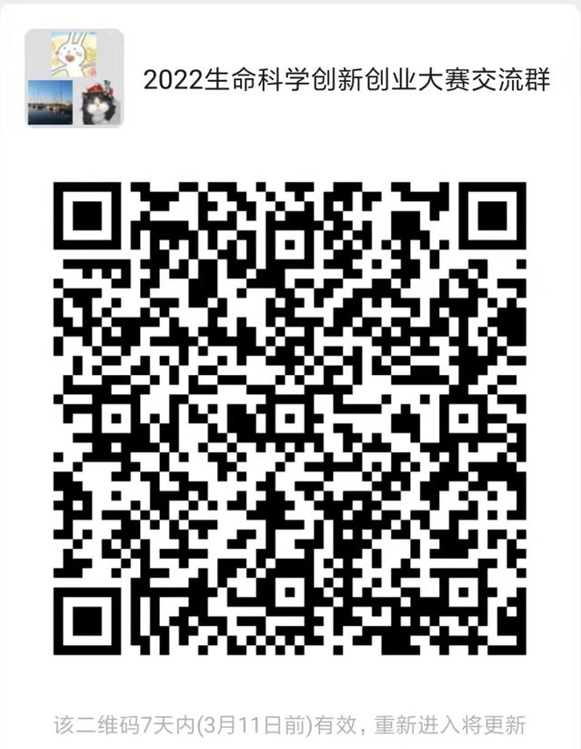 请各参赛项目指导教师与负责同学加入“2022年全国生命科学创新创业大赛”微信群,2022年3月11日前扫码进入有效)