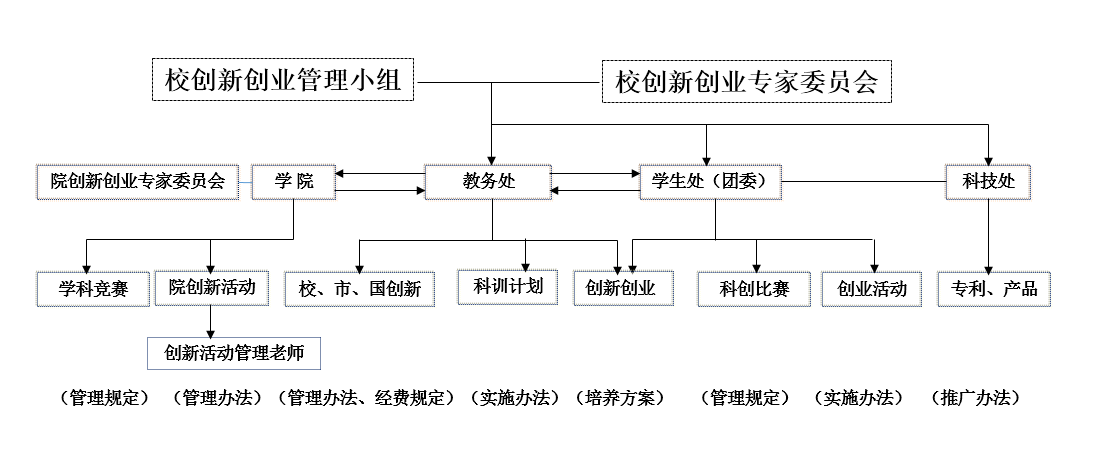 学校成立大学生创新创业工作领导小组,由学校领导任组长,成员单位由学院、教务处、学生处(团委)、人事处、科技处、财务处、实验室与设备管理处、后勤管理处、图书馆和大学科技园等组成。领导小组负责大学生创新创业计划制定、出台政策、经费管理等,下设办公室挂靠教务处,办公室负责日常工作的开展。创新创业管理机制如下图所示。